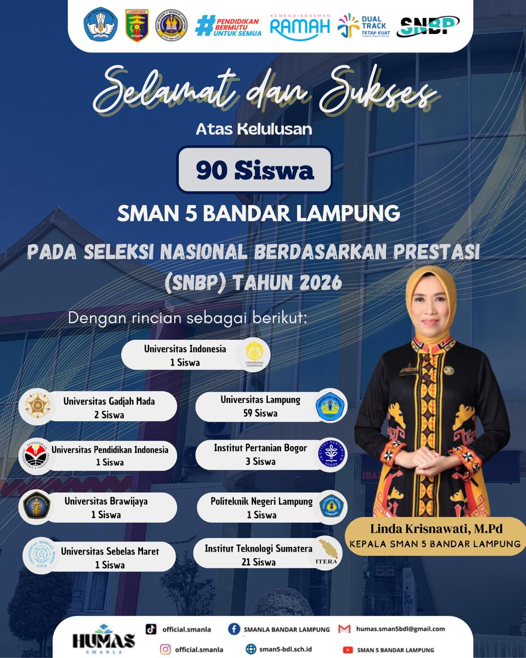Dari 142 siswa yang berkesempatan mengikuti SNBP, sebanyak 90 siswa dinyatakan diterima di perguruan tinggi yang mereka impikan. Hal ini merupakan sebuah pencapaian luar biasa yang tidak hanya membanggakan siswa kelas XII, tetapi juga seluruh keluarga besar SMAN 5 Bandar Lampung. Dari 90 siswa tersebut, 3 di antaranya diterima di tiga perguruan tinggi terbaik di Indonesia, yaitu 2 siswa di Universitas Gadjah Mada dan 1 siswa di Universitas Indonesia. Selain itu, terdapat 59 siswa yang diterima di Universitas Lampung, 1 siswa di Universitas Brawijaya, 1 siswa di Politeknik Negeri Lampung, 1 siswa di Universitas Sebelas Maret, 1 siswa di Universitas Pendidikan Indonesia, 2 siswa di Institut Pertanian Bogor, dan 21 siswa di Institut Teknologi Sumatera. Pencapaian ini tidak hanya menjadi kabar bahagia bagi siswa kelas XII, tetapi juga bagi dewan guru dan adik-adik kelas, karena hasil tersebut dapat membuka peluang yang lebih besar bagi angkatan selanjutnya dalam melanjutkan pendidikan ke perguruan tinggi.