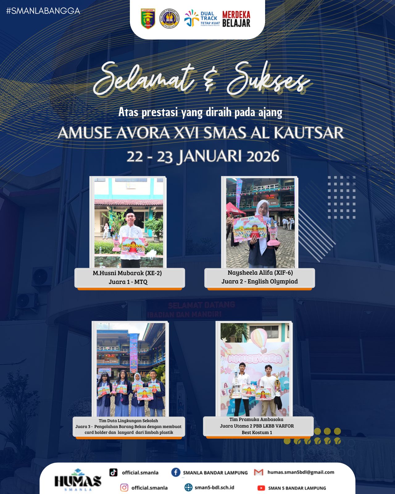 Pada tanggal 22-23 Januari 2026, Siswa siswi SMAN 5 Bandar Lampung mengikuti ajang perlombaan Amuse Avora yang diadakan di sekolah Al-kautsar. Mereka tidak hanya memeriahkan ajang tersebut, tetapi juga berhasil mencatat sejumlah prestasi di berbagai bidang perlombaan.