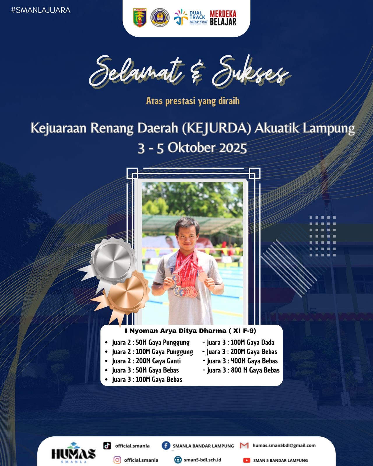 Pada tanggal 3-5 Oktober 2025, telah diselenggarakan Kejuaraan Renang Daerah (KEJURDA) Aquatic Lampung di Kolam Renah Pahoman, Bandar Lampung. Siswa bernama I Nyoman Arya Ditya Dharma membawa pulang banyak medali atas kemenangannya pada kejuaraan tersebut. Ia meraih juara dalam berbagai kategori, seperti Juara 2 pada kategori renang 50 meter gaya punggung, 100 meter gaya punggung, dan 200 meter gaya ganti. Lalu, Ia juga meraih Juara 3 pada kategori renang 100 meter gaya dada, 200 meter gaya bebas, 400 meter gaya bebas, 50 meter gaya bebas, 800 meter gaya bebas, serta 100 meter gaya bebas.